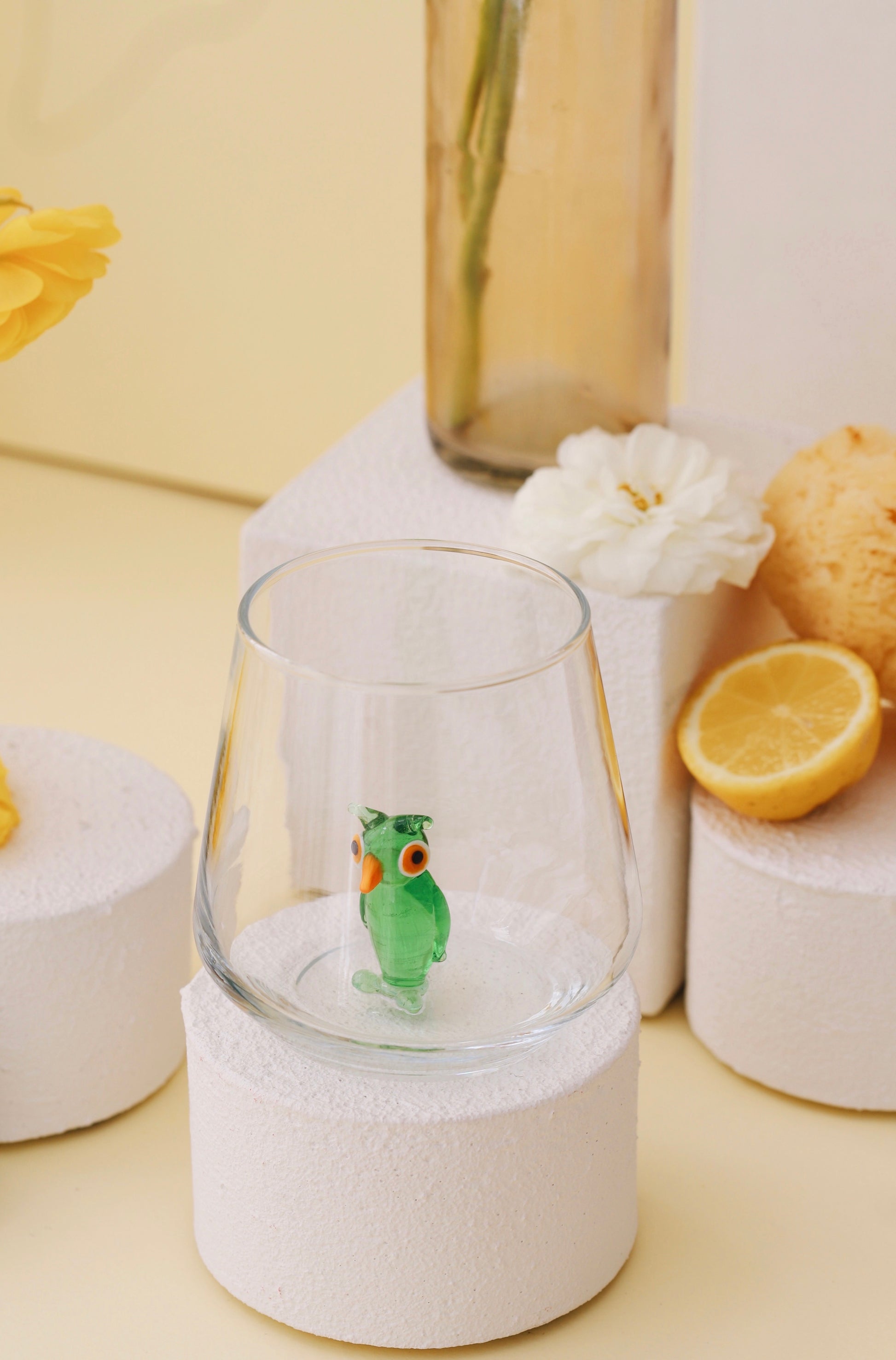 Es handelt sich um ein Wasserglas mit 345cc mit einer Eulen Figur aus Murano Glas in der Glasmitte.