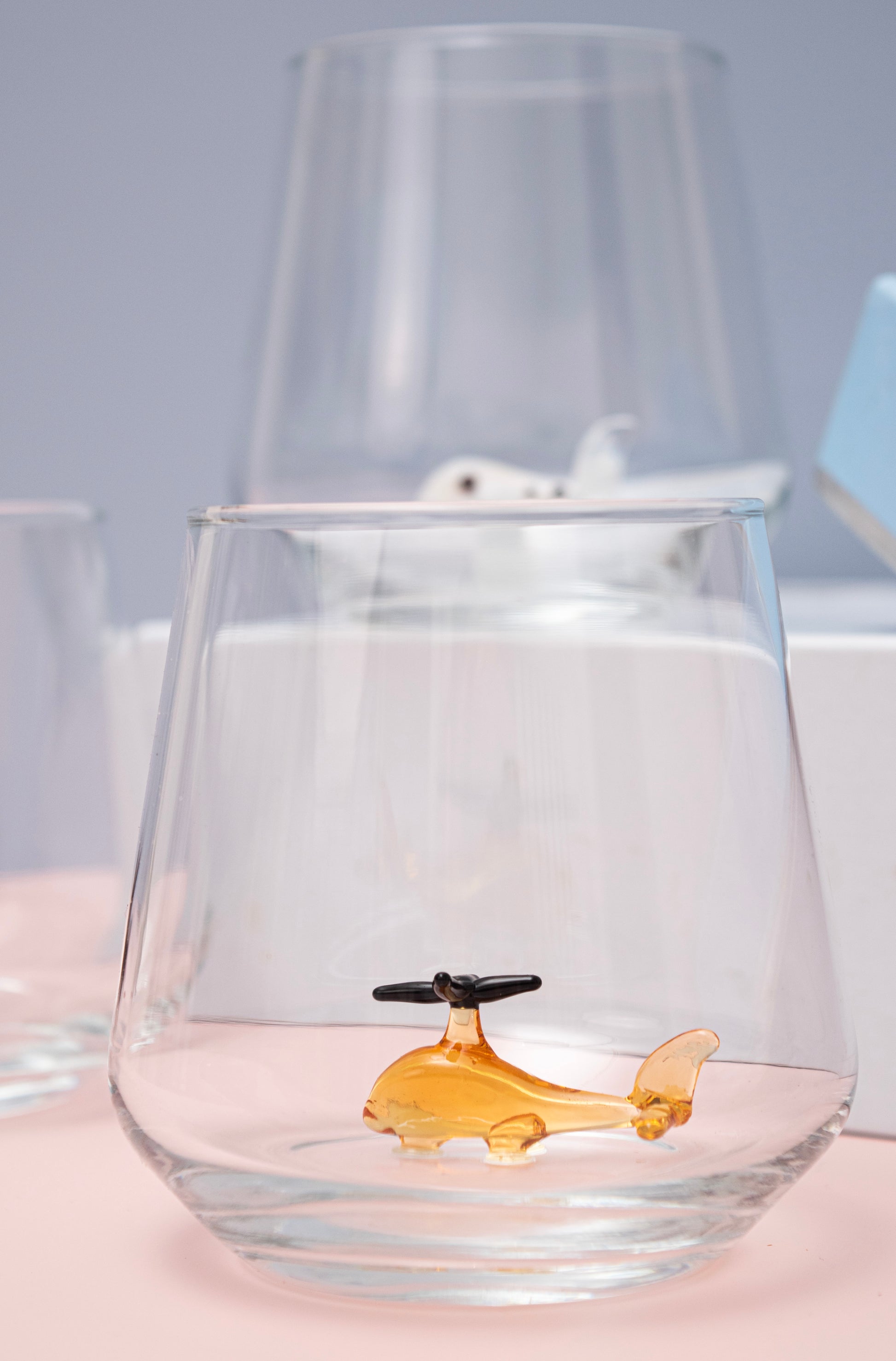 Es handelt sich um ein Wasserglas mit 345ml mit einer Helikopter Figuraus Murano Glas in der Glasmitte.