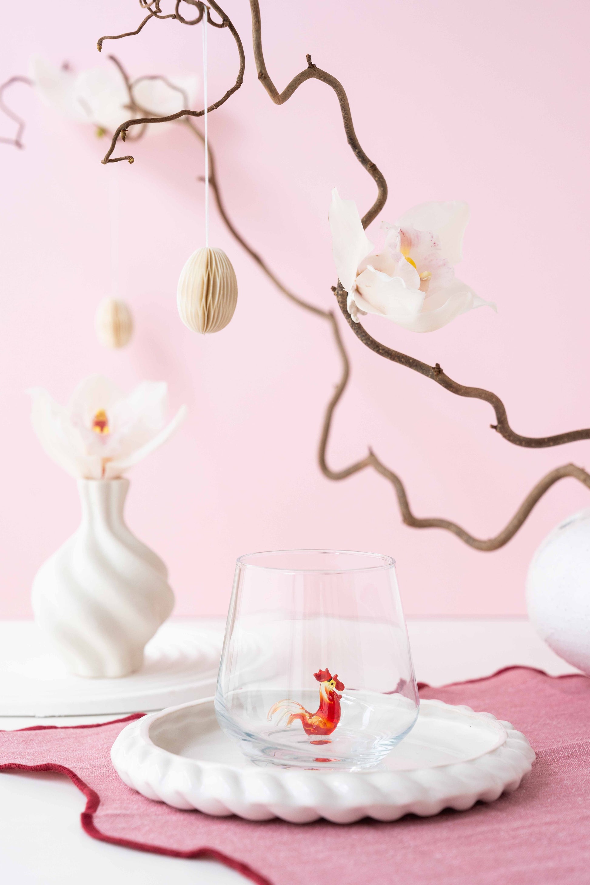 Es handelt sich um ein Wasserglas mit 345ml mit einer Hahn Figur aus Murano Glas in der Glasmitte.