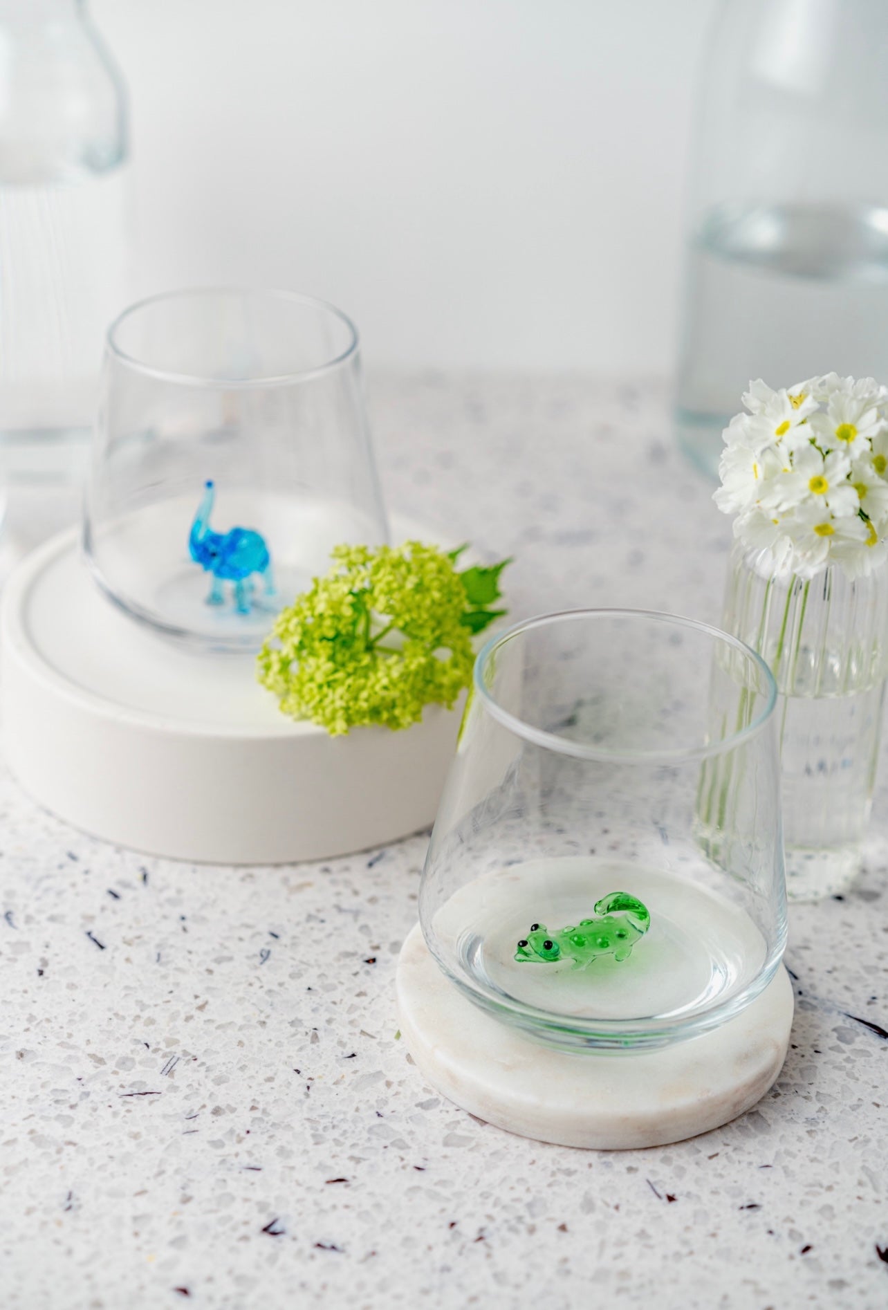 Es handelt sich um ein Wasserglas mit 345ml mit einer Krokodil Figur aus Murano Glas in der Glasmitte.